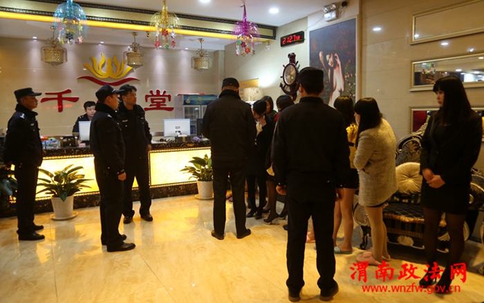 渭南政法网(特约通讯员 李晓艳)2月15日,大荔县公安局抽调治安大队、东关和西关派出所,组织民警在城区开展治安大清查。统一行动从当晚9时开始,将足浴、洗浴和歌厅作为重点清查对象,开启拉网式检查。此次行动共出动警力90余人,清查城区足浴、洗浴和歌厅25家,发现治安隐患8起,对渭南电视台《百姓问政》栏目曝光的“千指堂”、“养生堂”两家足浴店和清查中的龙泉水疗责令停业整顿,治安处罚10人,其中5人给予行政拘留。