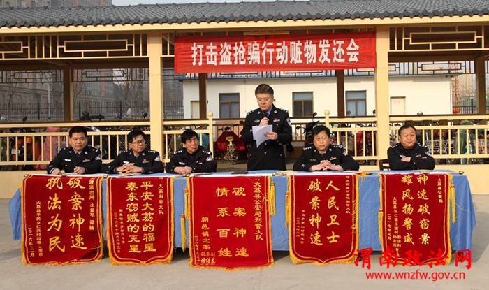 为了宣传打击盗抢骗行动战果,鼓势气,震邪恶、扬警威,树形象,推进“盗抢骗”专项行动向纵深开展。2月17日上午,他们在县公安局机关大院召开了“盗抢骗”行动赃物发还会,会议由刑事侦查大队长杨景奇主持,公安局党委委员吴巍宣布了打击“盗抢骗”专项行动战果,并对开展好打击“盗抢骗”行动再动员再部署,号召民警再接再厉,攻难坚克,不畏艰辛,打击刑事犯罪,竭尽所能挽回群众损失。
