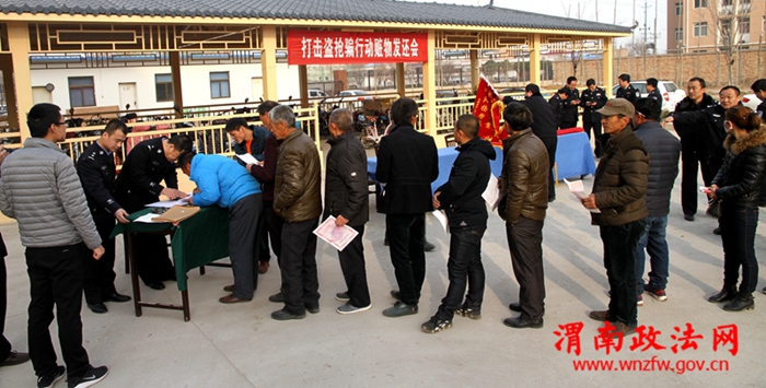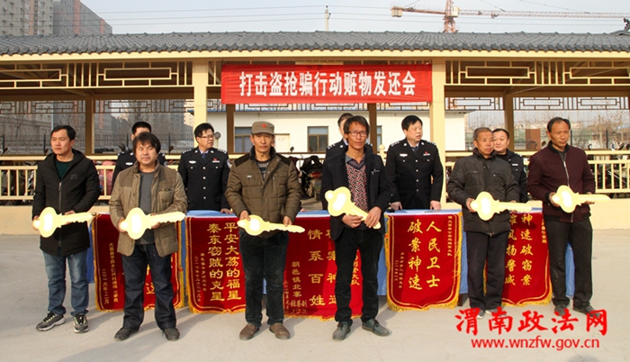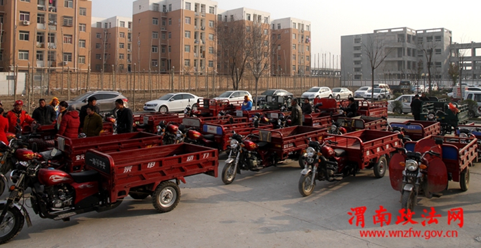 渭南政法网(特约通讯员李晓艳 张全才)2月17日上午,大荔县公安局在机关大院召开赃物发还会,将破案追回的27辆三轮车发还受害人。