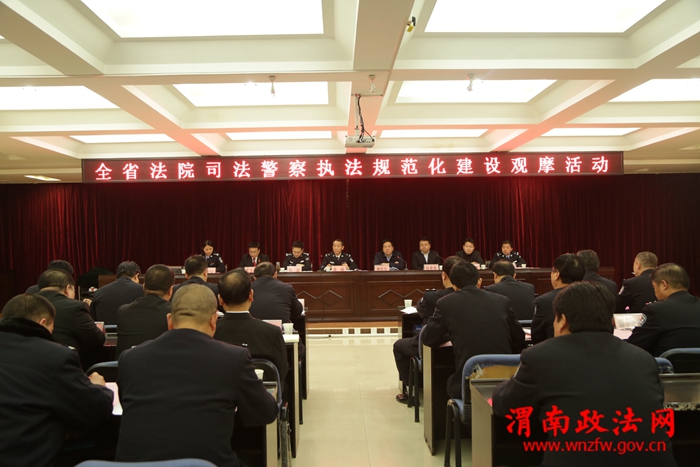 渭南政法网(特约通讯员 贺康乐 李园)2月16日下午,全省法院司法警察执法规范化建设观摩会在蒲城法院举行,省法院法警总队政委高峰、副总队长杜宏等出席观摩会,全省各中级法院法警支队支队长(政委)、渭南中院分管法警工作的副院长傅桥舟、政治部副主任刘文鼎、渭南中院法警支队、直属大队负责人及全市各基层法院主管法警工作的副院长、法警大队负责人等共80余人现场观摩了蒲城法院司法警察工作规范化建设成果。蒲城县委政法委书记张景锋、蒲城县法院院长王玉琦等陪同观摩。