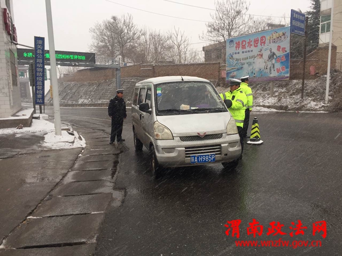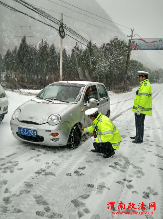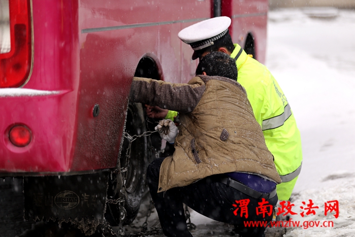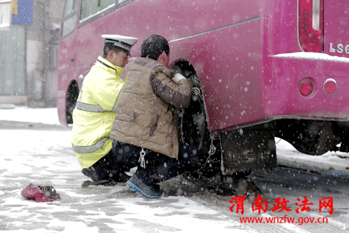 在路口处,民警们身穿亮绿色的反光执勤服,一边用各种手势指挥路面交通,一边时不时地吹哨子提醒过往司机。虽然路面湿滑,但执勤民警并没有放慢脚步,他们快速地挪动步伐,在路口的四个角落来回走动;在汽车站点,民警们细心检查过往车辆,并协助客运司机安装防滑链。寒风中,他们一个个脸色通红,帽子上积了一层雪。在各位民警的辛勤指挥下,潼关各主要路段路口交通秩序井然,周边路段未出现大面积拥堵。