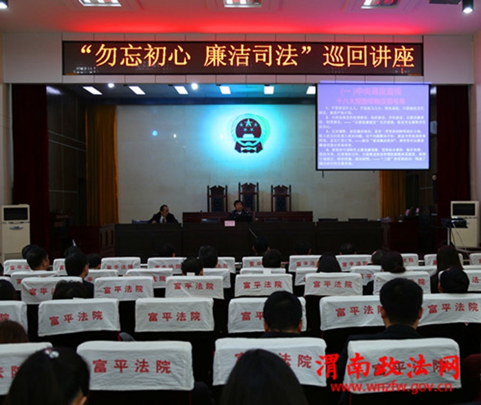 渭南政法网(特约通讯员张茜瑜王进)为了提高春训教育的实效,增强全院干警廉洁司法意识,2月20日上午,富平法院特邀原陕西省未成年犯管教所纪委书记、省委政法委、省委组织部、省司法厅“警示教育基地”负责人、调研员翟学荣来院做“勿忘初心、廉洁司法”巡回讲座。讲座由该院党组成员、副院长田永华主持,全院干警认真听取讲座。