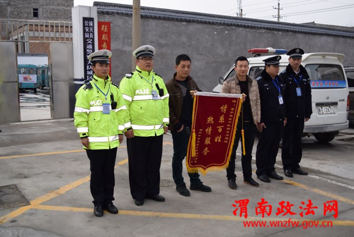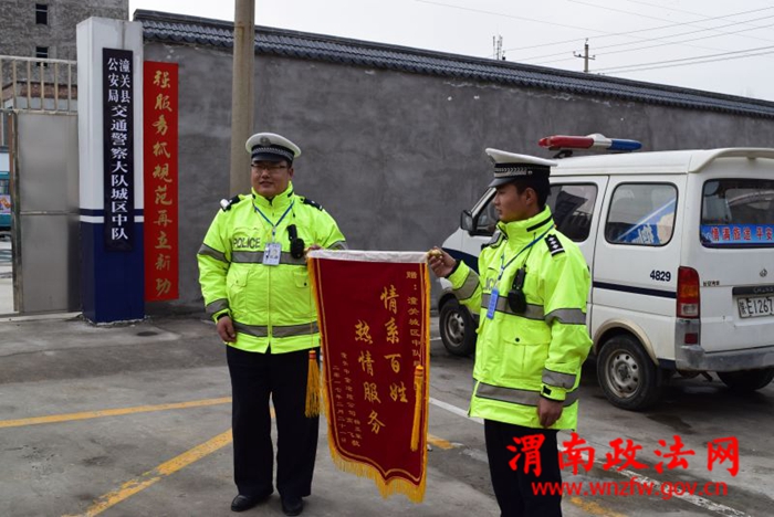 渭南政法网(特约通讯员王希娜)2月22日,潼关县中金冶炼公司杨先生,高先生专程来到潼关交警城区中队,将一面写有“情系百姓,热情服务”的锦旗送到城区中队民警手中。原来,就在几天前,杨高二人驾驶的机动车坏在半路,幸遇城区综合巡查班石鑫班组,在了解情况后,民警立即联系修理工,并用巡逻车辆接至现场,直至车辆修好才放心离去。杨某非常感动,这才出现了开头的一幕。