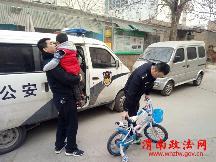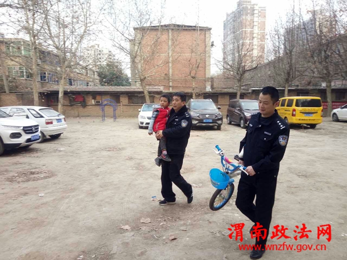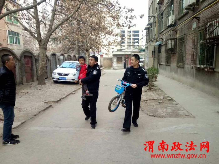渭南政法网(临渭公安讯)2017年3月4日13时许,临渭分局解放路派出所值班民警巡逻至西潼路与前进路十字卫校附院门口时,发现路边有一个大约五、六岁的小男孩独自哭泣,旁边放着一辆童车,当时路上车流量极大,非常不安全。巡逻民警立即上前查看询问,得知孩子中午和外婆一起出来后走失,但是说不清住址和家人信息。细心的民警分析到,既然孩子携带童车,住地应该不会很远。民警利用自己对辖区单位、小区熟悉的条件,多方联系辖区物业人员打听了解,并向附近门店商户逐个打听。