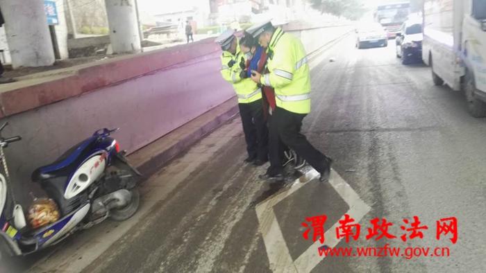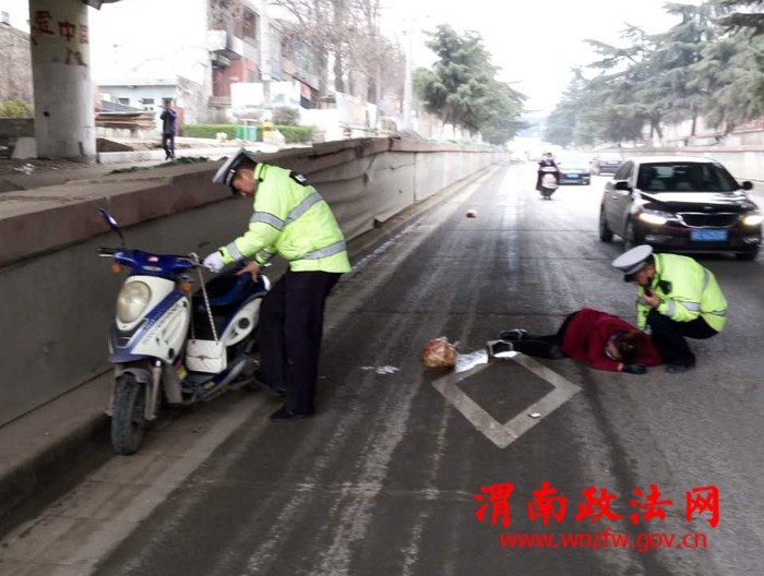 渭南政法网(临渭交警讯)3月23日,闫村中队民警正在火车站附近执勤,发现一骑电动车的中年女子不慎摔倒,驾驶员受伤躺在路边,电动车压在其身上令其动弹不得,民警见状立即上前帮助其脱离困境,搀扶到路边休息,在确认其伤情没有大碍后,民警才离开了现场继续疏导交通...