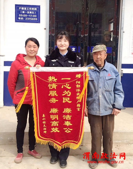 近日,阳郭所户籍室外鞭炮齐鸣,姜某的父亲和田某将一面印有“一心为民 廉洁奉公 热情服务 廉明高效”的锦旗送到户籍民警王馥佳手中,感谢民警耐心、细致的解决户口难题。