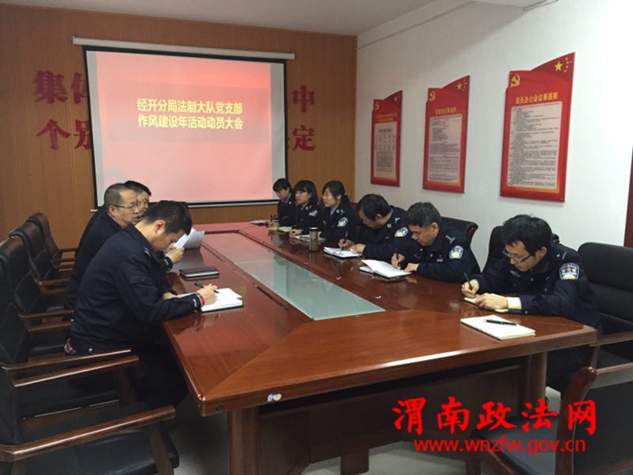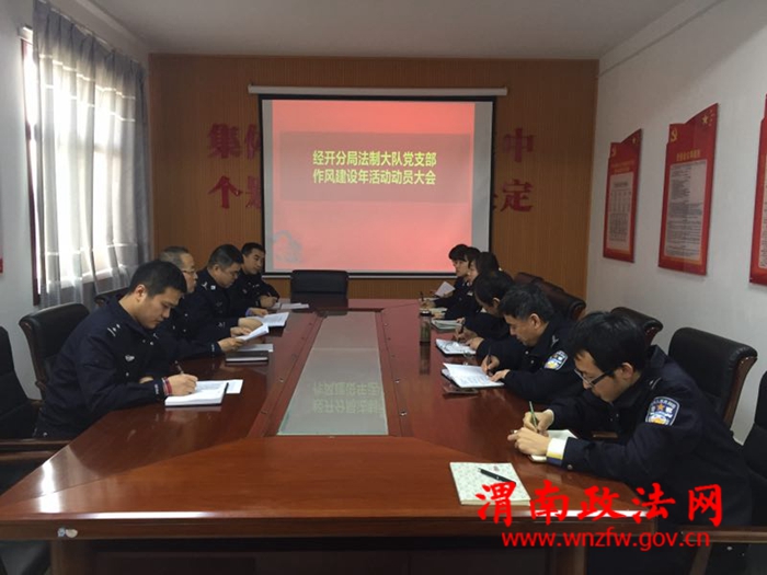 渭南政法网(特约通讯员刘孟德)4月6日,渭南市公安局经开分局法制大队党支部召开大会,对“作风建设年”活动,进行再动员再安排再部署,分局党委委员、副局长朱纪虎以普通党员身份,参加了支部会议并作了发言,法制大队全体党员民警辅警参加了会议。