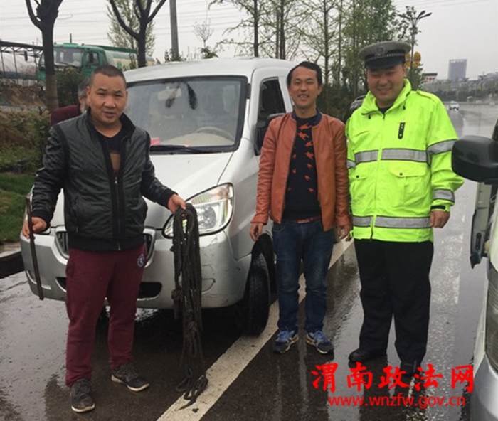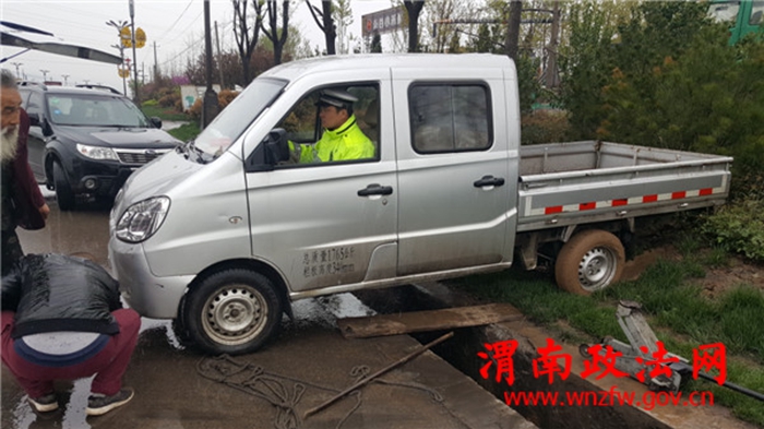 4月10日上午10时许,该局交警大队西庄中队民警杨超、杨明两位民警赶往党家村路口执行特勤任务,在行驶至108国道上甘谷段时,发现一辆双排车掉进了近60厘米深的沟渠,民警立即下车进行援助。经了解得知,由于降雨路滑,再加上视线模糊,驾驶员在停车时忘记拉手刹,车子打滑溜进路边沟渠。当时,天上还在下着中雨,而该路段位于108国道上甘谷村的急转弯路口,情形十分危险。为避免二次事故,二位同志立即上前想办法。他们尝试组织人力推车,可是,路面泥泞不堪,几次尝试都以失败告终。后来,两位民警用车上的千斤顶,将车子打起,又在渠道上放置了两块厚木板。随后,杨明叫来的小轿车也赶到了现场,杨超驾驶着双排车慢慢地把车开出来。看见车子开出来了,驾驶员激动的拉着两位民警的手说:“多亏两位交警冒雨帮助!”而此时,两位民警全身上下已经被雨水“浇”透。