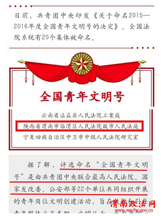 渭南政法网(特约通讯员 高增恩)2017年4月14日最高法院公布:共青团中央联合最高法院、国家发政委、公安部等22个单位共同组织开展的青年文明号创建活动评选结果《关于命名2015—2016年度全国青年文明号的决定》。全国法院系统有20个集体被命名,临渭区人民法院故市人民法庭作为全省法院唯一获得此项殊荣的单位榜上有名。同时这也是故市人民法庭继荣获“全国法院系统指导人民调解工作先进集体”和2013年荣获“全国法院先进集体”后的又一项国家级表彰奖励。