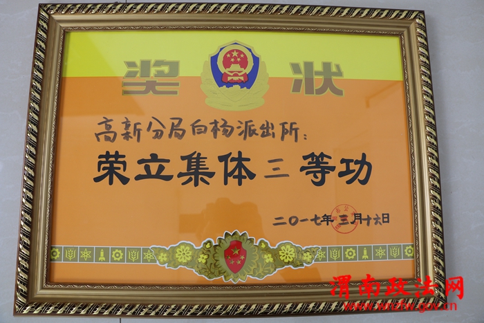 渭南政法网(特约通讯员 闫飞)2017年3月,高新公安分局白杨派出所被渭南市公安局授予集体三等功。