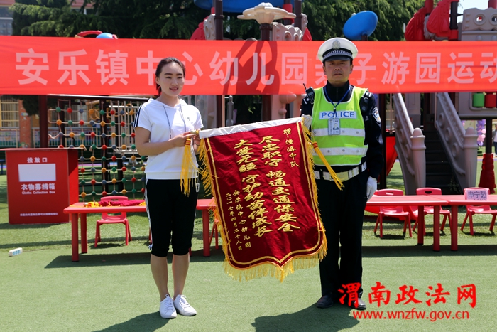 活动中,交通民警陶剑为学生、家长上了一堂生动活泼的交通安全教育课,向同学们讲解了各类交通违法行为典型案例,通过传授交通安全知识、介绍各种交通信号标志的意义和作用,要求学生家长在上学、放学接送孩子路上要遵守交通规则,熟悉并爱护交通标志,不要在人行道上追逐打闹、过马路要走人行横道以及正确乘坐车辆等交通安全知识。同时民警和学生们一起做游戏、交流互动,以寓教于乐、直观、贴切实际的教育手法积极向学生们传授日常的交通安全知识,对于家长们民警组织学习常见的道路交通法律、法规,为学生的生活起居、出行安全筑起一道保护屏障。中心幼儿园的郭文婧园长,为表示感谢潼洛中队多年以来对校园交安宣传共育幼苗的辛勤付出,现场赠送潼洛中队一面写有“尽忠职守 畅通交通保安全、大爱无疆 守护幼苗伴成长”的锦旗。