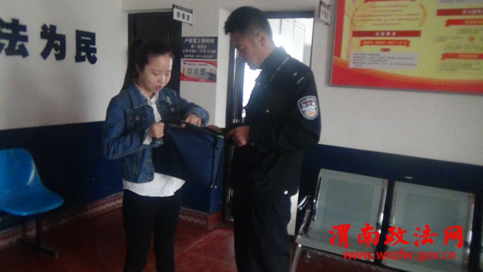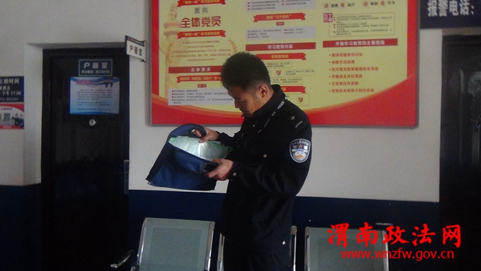 渭南政法网(特约通讯员 胡一瑛)“这个包要是丢了,我家小孩就没办法上户口了,太谢谢民警了”失主王琳激动的这么说,2017年4月25日下午13时许,王琳自己驾车从西安回到自己的户口所在地梅家坪派出所给自己的小孩上户口,此时正值中午时分,派出所办理户籍业务的群众较多,王琳就在派出所大厅里排队等候办理户口手续,这是有人给她打电话,她就顺手把装有孩子上户口所有手续的蓝色公文包放在了大厅的凳子上,打完电话后,王琳又着急开车离开,事后就将公文包的事忘记了,过了大约一个小时,富平梅家坪民警发现公文包后,就立即询问户籍室里面办理业务的群众,结果都不是他们的,民警无奈之下就翻看公文包内的资料,所幸的是找到了一个电话号码,民警尝试拨打电话,接电话的正是王琳本人,此时王琳才想起给孩子上户口的事,就马上开车返回派出所,民警让王琳查看一下自己的包是否有东西丢失,王琳看后激动地说:“没有丢东西,但是这个包非常重要,我孩子所有的出生手续都在里面,要是不见了,该怎么办啊,太感谢派出所的民警了!”民警连连摇手说:“不用谢,这是我们应该做的!”说完,民警带领王琳在户籍室顺利的给王琳的孩子上了户口。