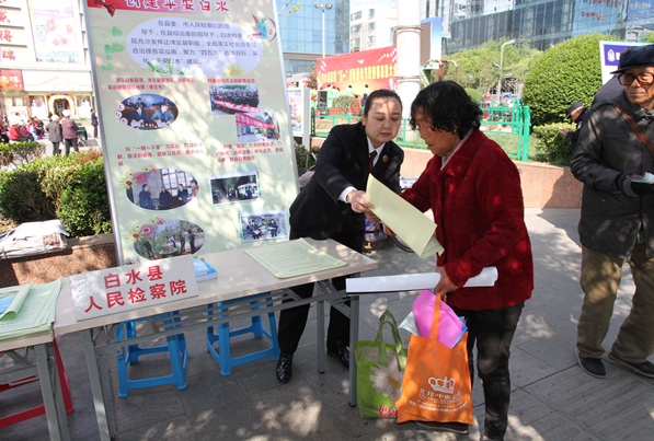 渭南政法网(特约通讯员 张婷)4月27日上午,白水检察院在县中心广场参加“综治和平安建设集中宣传”活动,主题是“发挥检察职能创建平安白水”。