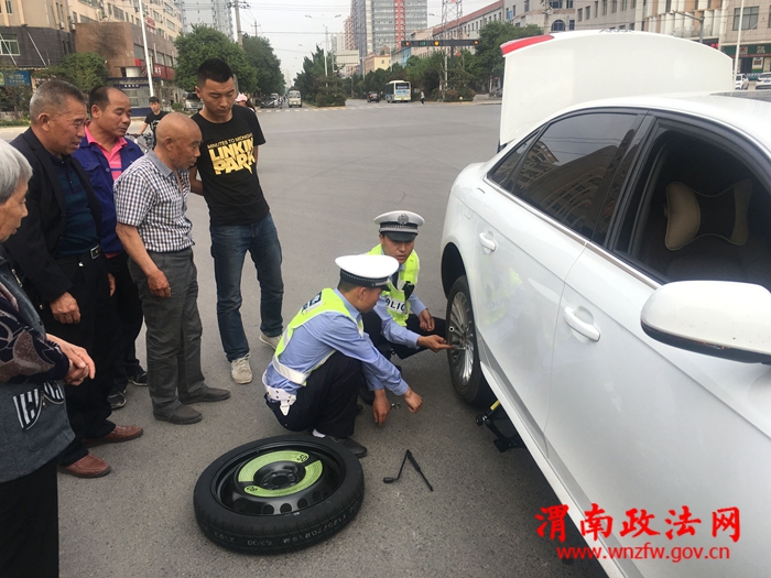 4月30日下午5点14分,城区中队民警王帅、朱军军、杨毅巡逻至朝阳大街与新盛路十字时,发现前方机动车道内停放着一辆小轿车,民警上前询问车主,原来是车辆轮胎爆胎,导致车辆不能正常行驶。