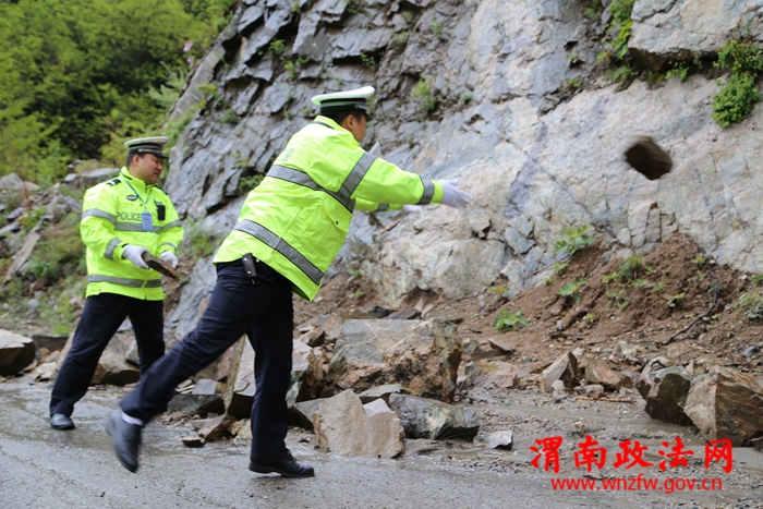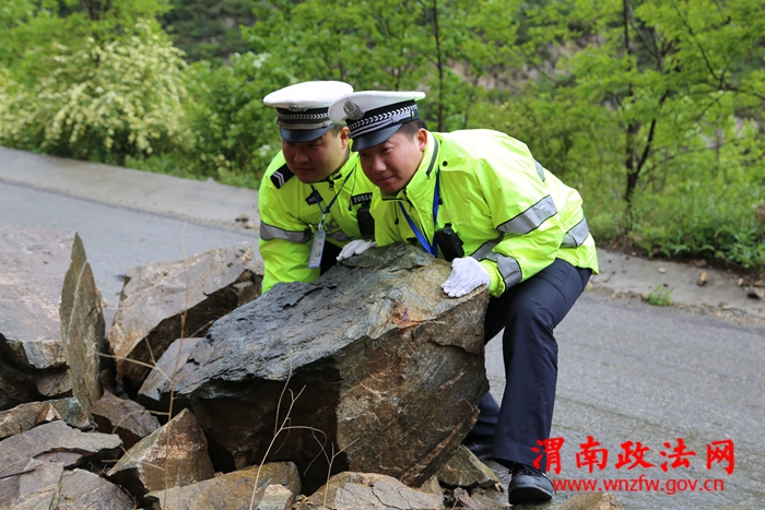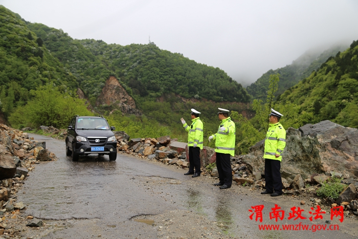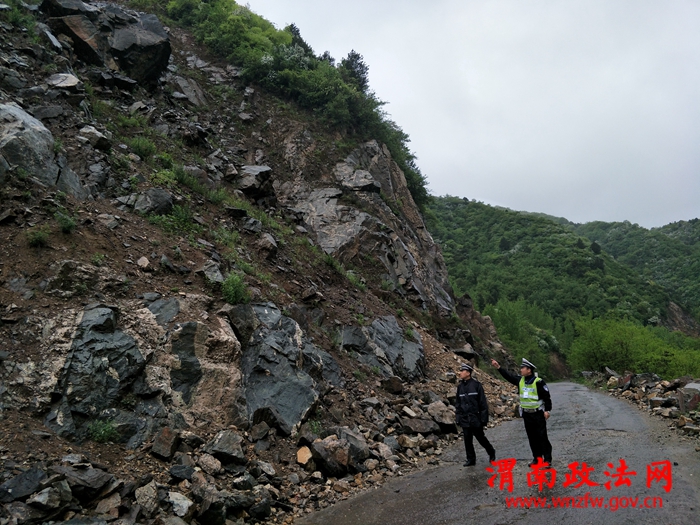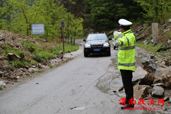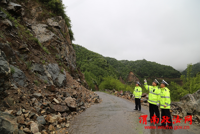 5月2日晚至3日,潼关县境内出现强降暴雨,导致辖区潼洛路发生大面积塌方、滚石,交通受阻,直接影响人民群众的正常生活及生命财产安全。得知情况后,潼关交警大队立即组织潼洛中队青年民警赶到现场排查疏导,清理路中落石,设置警示标志,疏散群众及车辆,防止意外发生。在现场青年民警站在危险前沿,耐心劝导过往车辆驾驶员及群众,确保人员安全。