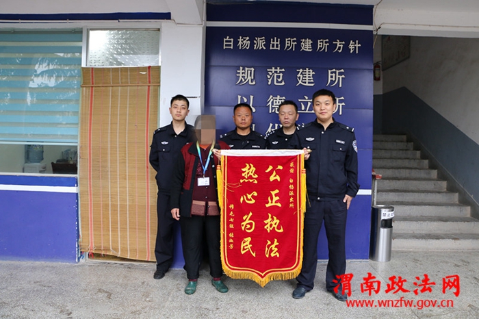 渭南政法网(特约通讯员 闫飞)5月3日上午,辖区一位老人王某冒雨带着一面印有“公正执法 热心为民”的锦旗来到白杨派出所,对派出所民警耐心调解,为其讨回被侵占财物表示感谢。