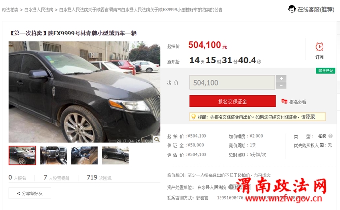 拍卖标的物情况:1、车牌号码为陕EX9999;初次登记日期为2012年1月27日;注册日期为2012年3月27日;车辆类型为小型越野车;厂牌型号为林肯牌MKT3498CC;发动机号码为BBJ53530;车辆识别代码为2LMHJ5AT3BBJ53530。起拍价:504100元,保证金:50000元,竞价增加幅度:2000元。2、坐落于渭南市白水县西固镇南北街东侧房产,产权证号为:白水房权证私产字第6482号。建筑面积751.17㎡(其中产权登记面积为751.17㎡;续建建筑面积为82.25㎡),土地使用权号:白国用2006第05003号,土地面积769.06㎡(实地勘测),约合1.15亩。起拍价:807700元,保证金:100000元,增价幅度:5000元。