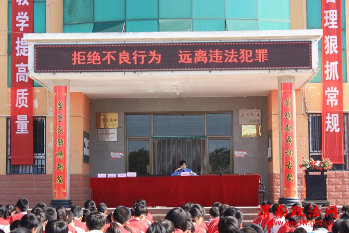 活动中,检察院预防青少年犯罪科干警结合现实案列,深入浅出,以通俗易懂的语言,声情并茂地给全体师生上了一堂生动的法制教育课。在讲座过程中,干警走下讲台,走进学生,以“什么是校园不良行为和违法犯罪行为”为话题开展知识竞答互动,同学们积极参与,踊跃发言,互动现场气氛浓烈。讲座结束后,全体学生进行“从我做起,人人争做守法好少年”宣誓仪式,将活动推向高潮。政法委干部围绕“创建平安校园,拒绝邪教危害”主题,在校园内出刊了宣传板报1期。