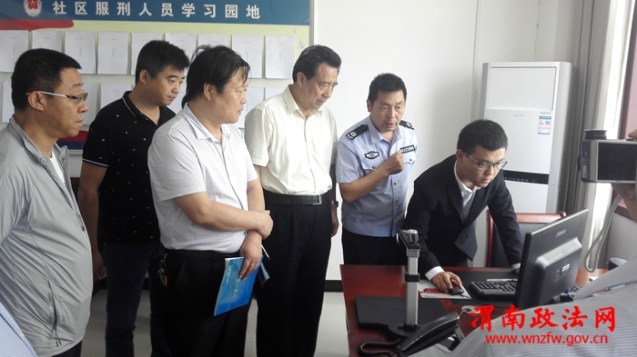 在白水县社区矫正中心,检查组听取了中心创建工作汇报,先后观摩了报到大厅、集中宣告、定位监控、心理咨询等功能室,查阅了社区矫正执法档案、考核记录,现场操作演示了手机定位、4G在线执法记录仪、视频报到电话、信息采集高拍仪等信息设备,详细了解了社区矫正执法大队的组织机构、岗位职责、管理运行等情况,与市、县相关负责同志及基层社区矫正工作者座谈,认真听取了白水县社区矫正工作开展情况、存在困难和意见建议。