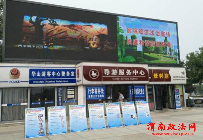 板前,几位游客一边驻足观看一边耐心听讲,对此深受启示。电子显示屏上在播放雄奇壮美的华山画面的同时,将普法短视频、法治标语穿插其中,让游客学会用法律保护自己。此外,还通过播放平安建设音响、悬挂横幅标语、讲解咨询、互动交流等方式,就进行了全方位、多形式的普及宣传。