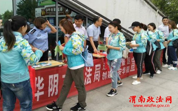 在售票大厅门口,司法局法治宣传咨询台格外惹眼,普法人员身着制服,热情的向前来的广大游客积极宣传《宪法》《消费者权益保护法》《旅游法》及反邪教等法律法规知识,发放华阴市“七五”普法常用法律知识读本、公证、法律援助宣传单和手提袋。来自广东梅州20多人的旅游团队接到司法局赠送的普法礼袋和平安福带后赞不绝口,其中一位游客握着局长苗健的手高兴的说到:“我来华山旅游,没想到还能收到法律礼袋和平安福带,谢谢你们!”反邪教宣传展