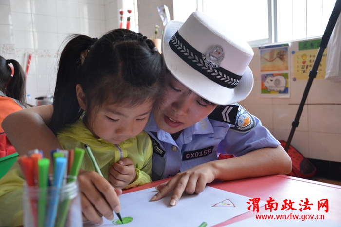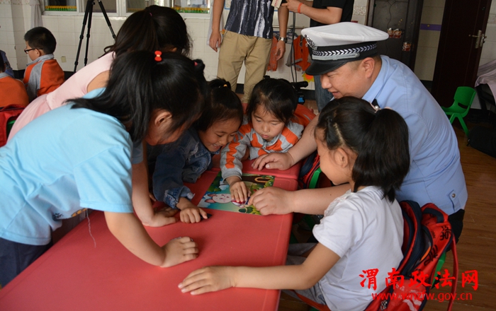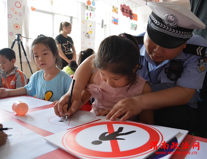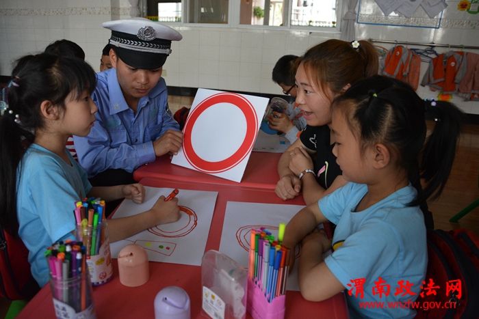 渭南政法网(特约通讯员 吴晓锐)“交通信号灯有哪几种颜色?”“红、黄、绿。”“过马路要走什么线?”“斑马线……”“你画的是什么标志?在哪看到过这些标志?”“限速标志,在大树上看到过……”这是5月24日,高新交警大队城区中队民警和事故预防与处理中队的民警们与小朋友们进行交通安全知识互动的场面。