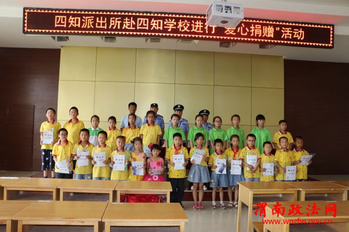 渭南政法网(特约通讯员张凯 沈斌)5月31日下午,为切实加强辖区校园安全保卫工作,增强在校师生的法制意识,提高未成年人的安全防范意识和自我保护能力,潼关四知派出所组织民警在四知小学开展了以“关爱儿童,反对拐卖”为主题的“六一”儿童节禁毒与防拐骗法制宣传活动,为在校师生带来了一堂生动活泼的法制安全教育课。同时,慰问了在校贫困学生。