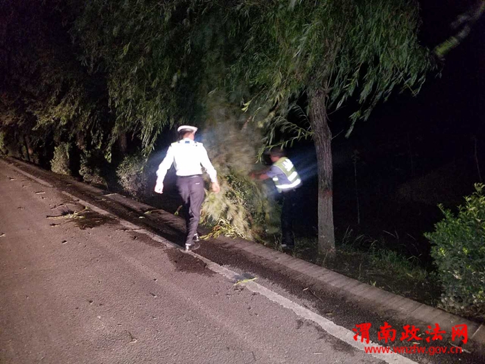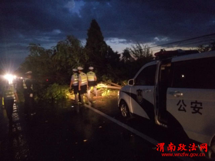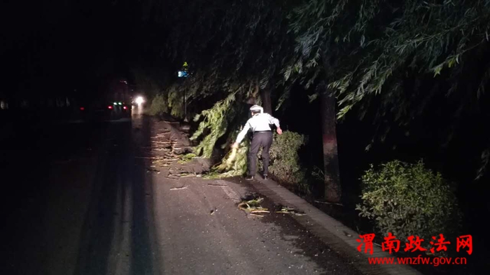 当晚,仅华朱至怀德大街一段,就有数棵大树被吹断,巨大的树冠横亘在道路上,两根电线杆被吹倒在道路,数十条各种电线电缆散落在地上,成为道路交通的极大隐患,时刻危险人民群众的生命安全,西禹中队民警进行道路巡查时,发现状况,民警首先在障碍物前设置了警示标志,及时通报供电部门采取相应措施,然后民警合力将树枝搬离路面,同时开展交通指挥疏导工作,保障了路面畅通和交通安全。