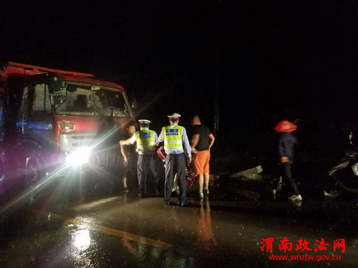 庄中中队民警巡查至庄里人民路时,发现一建筑工地两边围档被大风吹倒在路中间,民警立即冒雨将其移出路面,及时排除了交通安全隐患。晚12时许,中队领导带领民警冒雨巡查至富觅路时,发现一起交通事故,一辆大货车与一辆摩托车相撞,民警立即上前设立警戒线,控制肇事司机,协助救治伤员,指挥疏导交通,防止了次生交通事故的发生。
