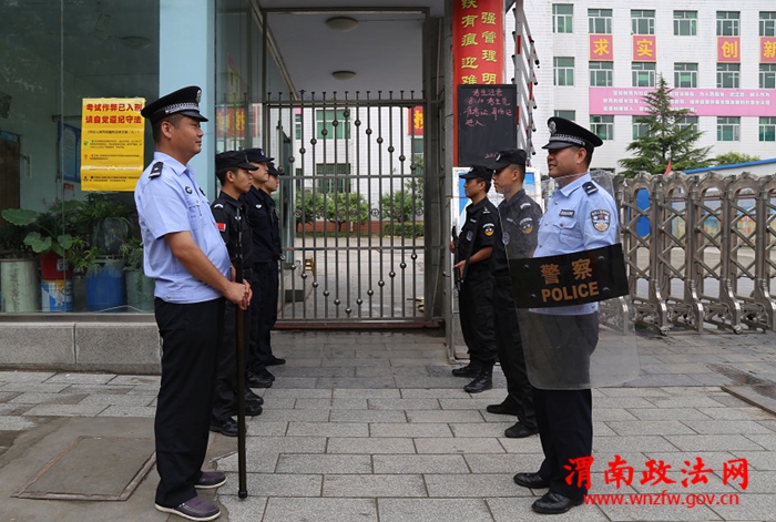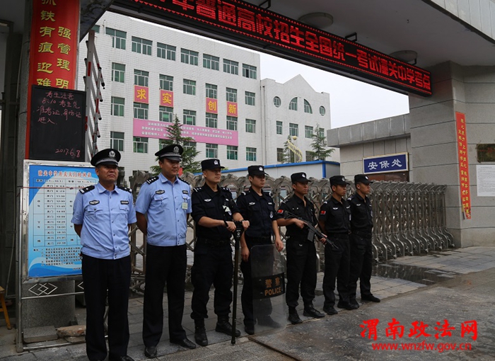 渭南政法网(特约通讯员孟思雨)6月7日,2017年高考拉开序幕,全国各地940万考生走向考场,社会各界广泛关注。怀揣梦想的莘莘学子、翘首以待的考生家长,考场内外,牵动无数颗心。而对公安民警而言,高考则是一场无硝烟的战争。在潼关,40余名公安民警坚守在考点,为考生助力、为高考护航。