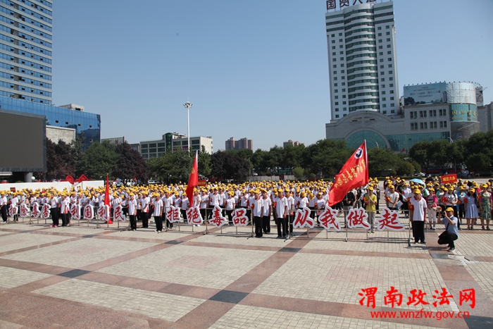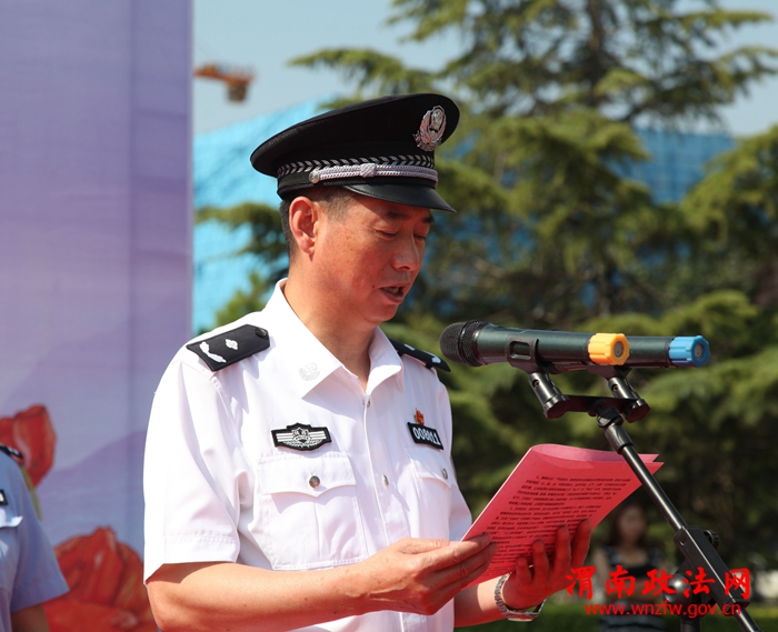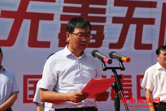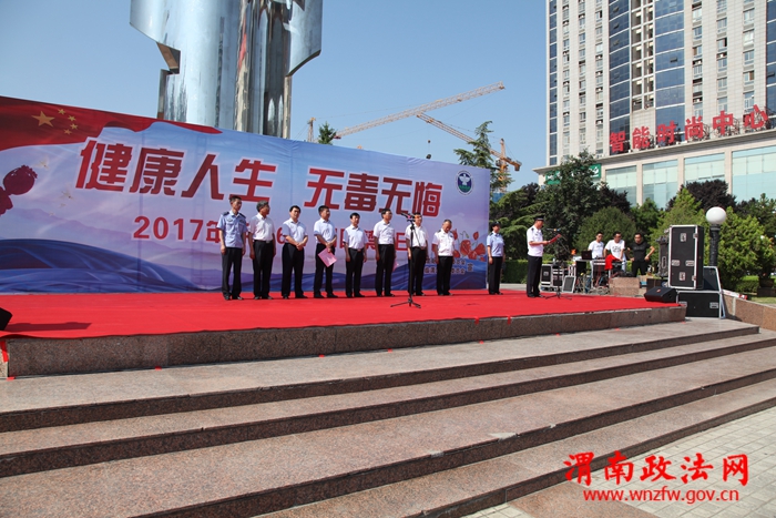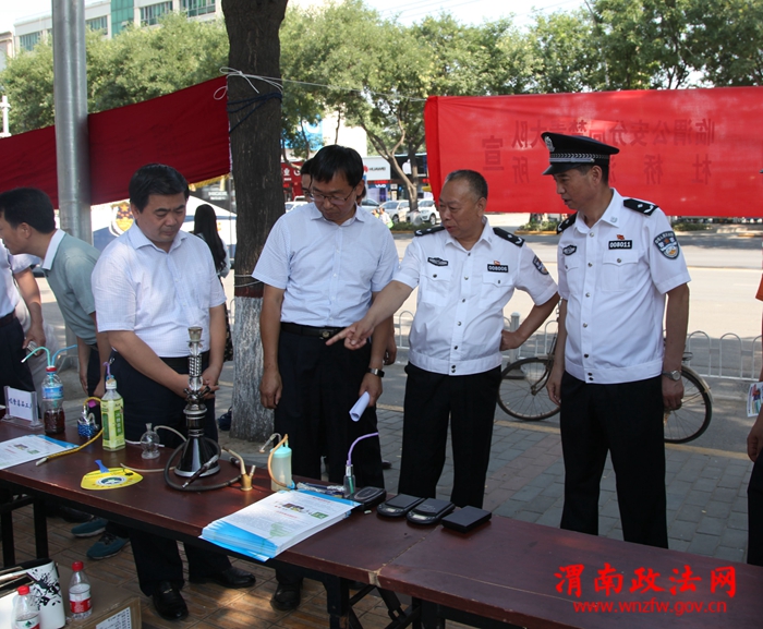 渭南市委常委、市委统战部部长、市委政法委书记樊存弟,渭南市副市长、市公安局局长杨建琦,临渭区区长刘宝琳,渭南市公安局副局长张金龙,临渭分局局长沈军,市禁毒支队支队长王晓鹏,临渭分局副政委张君萍等市区禁毒委员会主要领导出席此次活动。活动现场,临渭公安分局局长沈军向群众汇报了近一年全区禁毒工作开展情况,杨建琦副市长向全市人民发出全民禁毒倡议书,樊存弟书记向市、区两级禁毒志愿者授旗,1000余名禁毒志愿者进行了庄严宣誓,出席活动的领导及禁毒志愿者、群众在禁毒签名墙上进行万人签名。