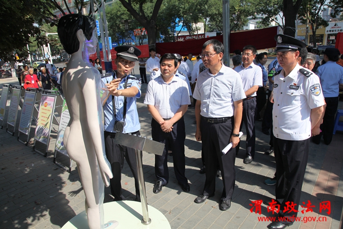 活动结束后,局长沈军陪同樊存弟书记一行来到禁毒宣传点进行观看和指导。禁毒大队、杜桥派出所、市区禁毒委成员单位设立禁毒宣传点,为群众发放禁毒宣传单、宣传手册、帽子、扇子,摆放展板、悬挂横幅,教育引导群众珍爱生命、远离毒品,增强识毒、拒毒、防毒意识。在宣传点现场,禁毒大队展示了“吸毒血液循环人体模型”,向市民演示了毒品通过鼻吸、口服、静脉注射、肌肉注射时,如何危害人体心脏、大脑的过程,使群众有了更为直观的认识,同时向群众展示毒品、毒具,让大家认识到毒品的危害,远离毒品。强制隔离戒毒所通过吸毒人员现身说法,东风派出所、解放派出所、站南派出所、环北派出所、向阳派出所在本辖区设立宣传咨询点开展宣传,农村各派出所结合本辖区实际,在辖区、学校进行宣传,从而形成全区全辐射宣传,让社会各界和广大群众充分了解毒品的危害性。省、市级20余家新闻媒体对此次活动进行了宣传报道。此次活动,共悬挂禁毒标语横幅50条,宣传展板60块,发放禁毒知识手册5000余份,发放车贴1000张,发放禁毒帽子1000顶,禁毒扇子1000个,宣传单15000余份,解答群众咨询2000多人次。