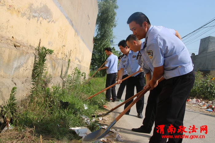 ---“党员活动日”义务打扫卫生。6月27日上午,大队党总支结合“党员活动日”活动,组织全体党员深入精准扶贫包联村---永定村开展党员义务劳动,为美丽乡村建设添砖加瓦。参加劳动的52名党员民警在党总支书记程伟峰的带领下,以身作则,充分发扬“一不怕苦二不怕脏三不怕累”的精神,对永定村主巷道进行了一次集中大清扫、大整治,对白色垃圾进行了地毯式清理。劳动过程中,全体党员顶着高温酷暑,拿起扫帚、铁锹等工具热火朝天地干了起来,认真清扫巷道两侧的垃圾和树叶,拔除墙角和缝隙杂草,清理干净排水渠理的污泥。经过全体党员一上午的辛勤努力,原本杂草丛生、沟渠污水横流、白色垃圾遍布的巷道环境,瞬间变得焕然一新。劳动结束后,党总支书记程伟峰指出:各支部要不定期的组织党员民警开展义务清扫,充分发挥党员先锋模范作用,以点带面提升村民卫生意识和环保意识,共同努力建设和谐美丽乡村。