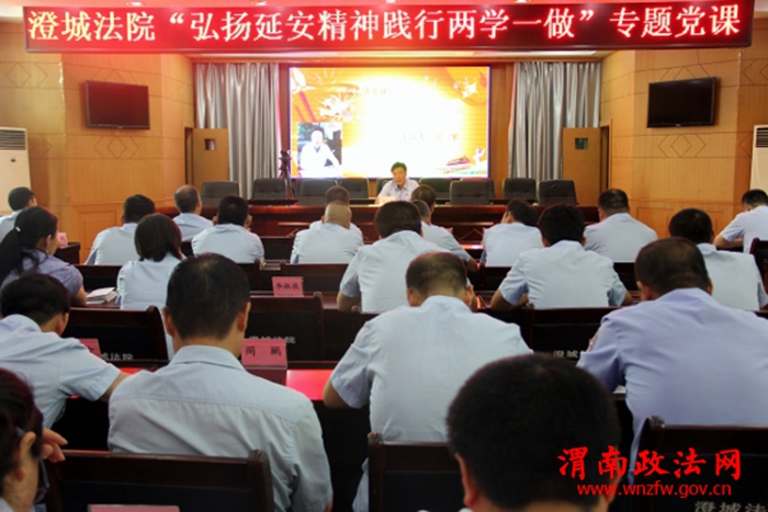 渭南政法网(澄城法院讯)为认真贯彻落实全面从严治党要求,推进“两学一做”制度化常态化,确保“两学一做”学习教育取得实效,不断改进审判工作;为进一步增强司法能力,提高司法水平,确保公正司法,真正做到权为民所用,情为民所系,利为民所谋,用实际行动搭建司法便民“连心桥”,7月3日上午,澄城县人民法院召开专题讲座,党组书记、院长周三军为全体党员干警上了一堂《学习延安精神,做司法为民的践行者》的专题讲座。