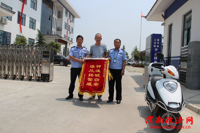 7月2日,犯罪嫌疑人唐某已被移交蒲城警方,被盗摩托车已经发还失主,失主樊某专门给乔山路派出所送来一面写有“神速破窃案,雄风扬警威”的锦旗以表达自己对富平公安的感谢之情。