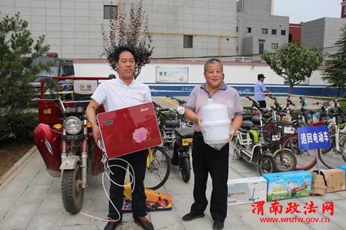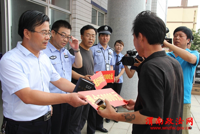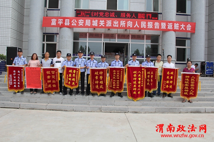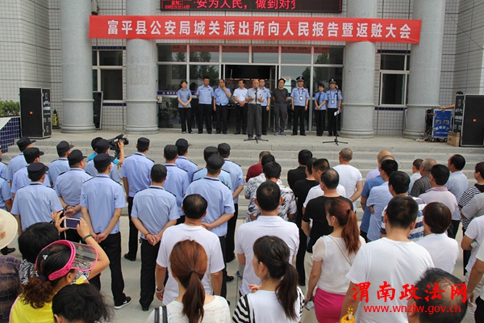 渭南政法网(特约通讯员 张剑)为进一步展示公安机关在维护稳定、打击犯罪、服务群众等工作方面取得的成果,塑造人民警察良好形象,深化警民和谐关系,7月4日,富平县公安局城关派出所召开向人民报告暨返赃大会,富平县委政法委副书记刘寅龙,检察院副检察长张绪刚,公安局政委李跃、副局长陈建锋等有关领导同志及受害群众100余人参加了此次活动。