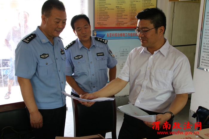 市委副书记武俊兴来到永定村委会,没有惊动正在完善扶贫台帐资料的民警,他从桌子上错落有致的台帐资料里随手抽出一份,进行了随机检查,当看见民警扶贫工作“一户一档”资料齐全,对包联贫困户家庭情况、个人情况掌握精准,并能因情制宜的提出脱贫帮扶计划后,市委副书记武俊兴对我队民警扎实细致的工作表示满意。接着,他听取了大队长程伟峰关于脱贫攻坚工作的简要汇报,随后,市委副书记武俊兴与我大队驻村工作队队长李麦山、驻村第一书记卫兴发就脱贫攻坚工作进行了座谈交流。