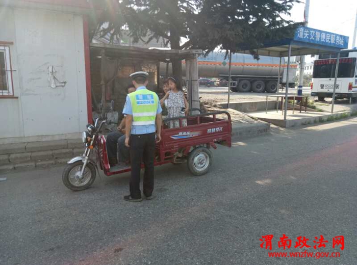 10时8分,民警在秦东省际交通安全执法检查站执勤时,一辆三轮摩托车车后车厢坐着两个人,民警发现该没有任何保护措施,非常危险,执勤民警立即将该车拦下进行检查。