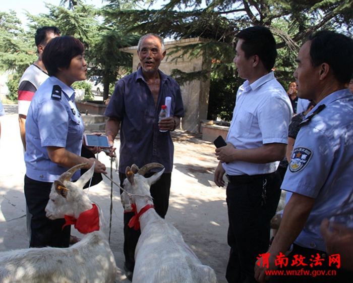 精准产业脱贫贫困户韩卫东从民警手中领取统一采购的奶山羊