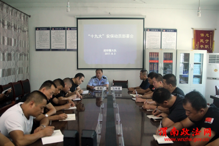 渭南政法网(富平公安讯)2017年8月3日下午,富平县公安局巡特警大队召开会议专题部署“十九大”安保工作。会上,大队长任军印组织传达了省、市、县公安机关关于 “十九大”安保总体要求,结合本单位工作实际,详细安排部署了大队“十九大”安保工作。