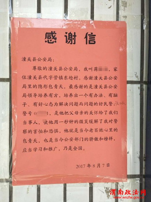 渭南政法网(特约通讯员聂晶软莹)2017年8月7日一大早,潼关县代字营镇蒋某某先后来到潼关县公安局及潼关县公安局城关派出所,送来感谢信,感谢警号为00**91的热心民警。