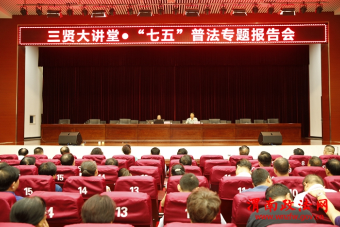 渭南政法网(特约通讯员杨俊丽张慕云杨荣辉)为全面实施“七五”普法规划,落实国家公职人员学法用法制度,不断提升领导干部、公务员运用法治思维和法治方式深化改革、推动发展、化解矛盾、维护稳定的能力。2017年8月9日上午九点,临渭区司法局会同区委宣传部,在区行政中心会议中心举办了三贤大讲堂·“七五”普法专题报告会,全体区级领导、各街镇、各部门领导干部及司法所长共300余人聆听了报告会。