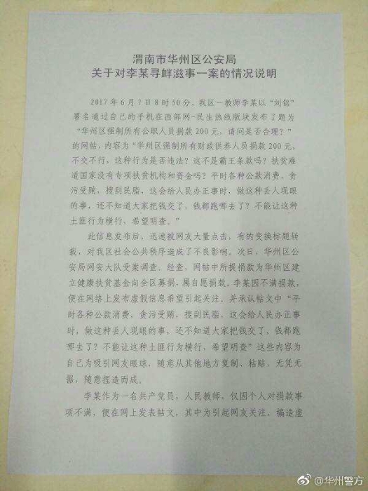 据北青报记者了解,2017年6月7日8时50分,华州区一教师李某以“刘铭”署名通过自己的手机在西部网-民生热线版块发布了题为“华州区强制所有公职人员捐款200元,请问是否合理?”的网帖,内容为“华州区强制所有财政供养人员捐款200元,不交不行,这种行为是否违法?这不是霸王条款吗?扶贫难道国家没有专项扶贫机构和资金吗?平时各种公款消费,贪污受贿,搜刮民脂,这会给人民办正事时,做这种丢人现眼的事,还不知道大家把钱交了,钱都跑哪去了?不能让这种土匪行为横行,希望明查。”