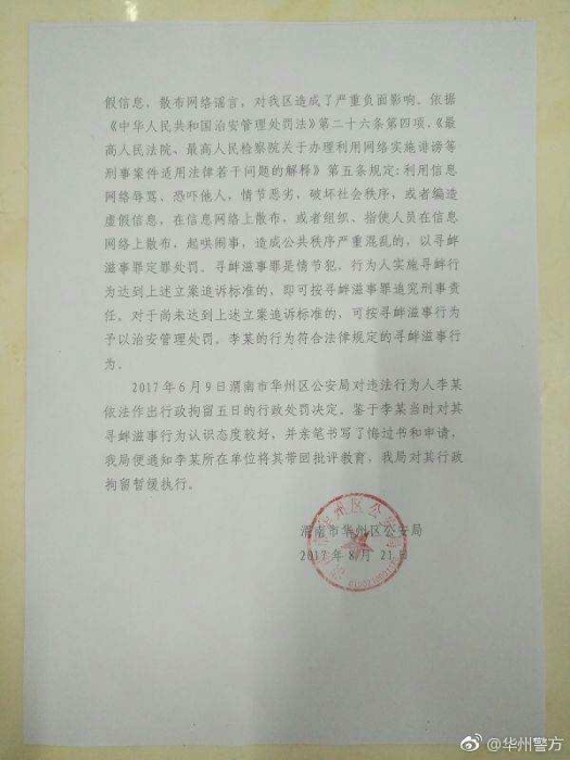2017年6月9日渭南市华州区公安局对违法行为人李某依法作出行政拘留五日的行政处罚决定。该局表示,鉴于李某当时对其寻衅滋事行为认识态度较好,并亲笔书写了悔过书和申请,便通知李某所在单位将其带回批评教育,对其行政拘留暂缓执行。