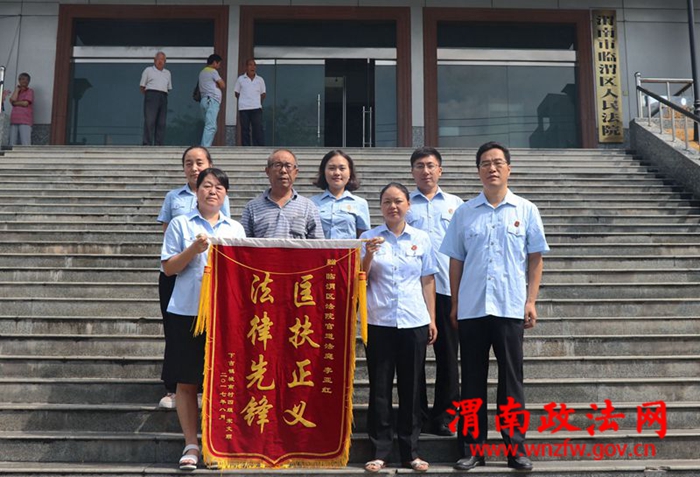 渭南政法网(特约通讯员 刘宓佳)8月22日,伴随着鞭炮声及周围群众的掌声,当事人宋某将一面写有“法律先锋,匡扶正义”的锦旗送到临渭区人民法院官道法庭庭长李亚红手中,表达自己的感激之情,“感谢法院的公正判决,维护了我的权益啊!”