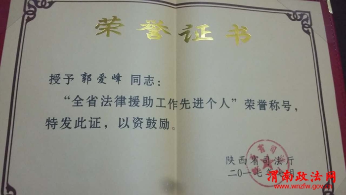 渭南政法网(潼关县司法局)日前,陕西省司法厅下发《关于表彰全省法律援助工作先进集体和先进个人的决定》(陕司通报【2017】94号),渭南市5家单位和5名同志被授予“全省法律援助工作先进集体”和“全省法律援助先进个人”,其中潼关县法律援助中心主任郭爱锋荣获全省法律援助先进个人。