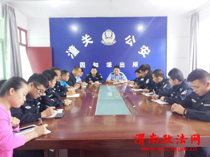 渭南政法网(特约通讯员 丁沙 贾妮)9月4日下午,潼关四知派出所召开会议,以“十九大”安保维稳为主题,传达了县局月例会精神,并深入领会学习贯彻局长姬刚民和政委游小兵的重要讲话精神。