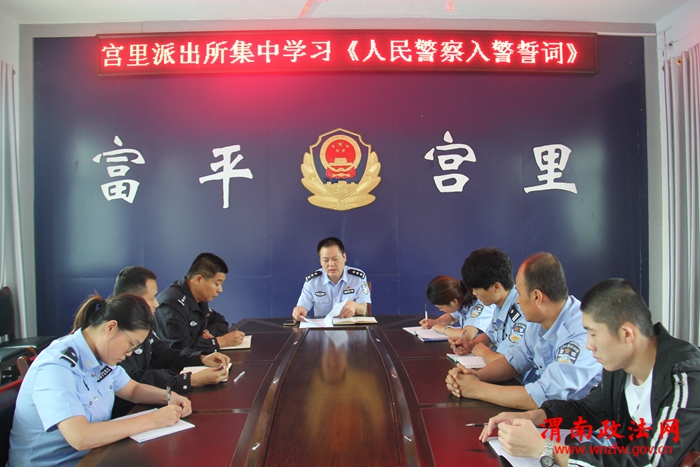 渭南政法网(富平公安讯)为认真落实富平县公安局关于学习贯彻习近平总书记在接见全国公安系统英雄模范立功集体表彰大会代表时的重要讲话精神部署要求,全面落实对党忠诚、服务人民、执法公正、纪律严明“四句话、十六字”总要求,9月1日中午,宫里派出所组织全体民警认真学习新修订的《人民警察入警誓词》。