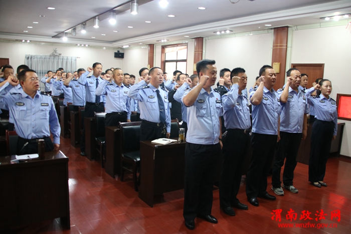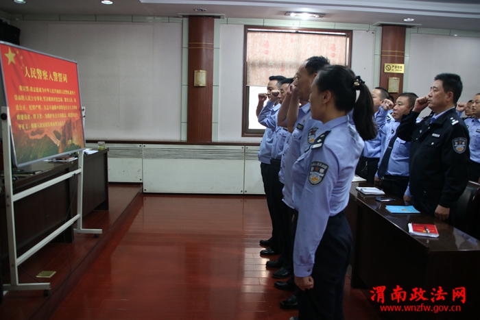 渭南政法网(特约通讯员高蕾 潘化团)为迎接党的十九大胜利召开,进一步增强民警的荣誉感和使命感,夯实队伍正规化建设成效。9月11日上午,我大队在二楼会议室组织全体民警学习新修订《人民警察入警誓词》,切实把“对党忠诚、服务人民、执法公正、纪律严明”十六字总要求在民警中树立起来,坚决落实下去、真正做到内化于心、外践于行。