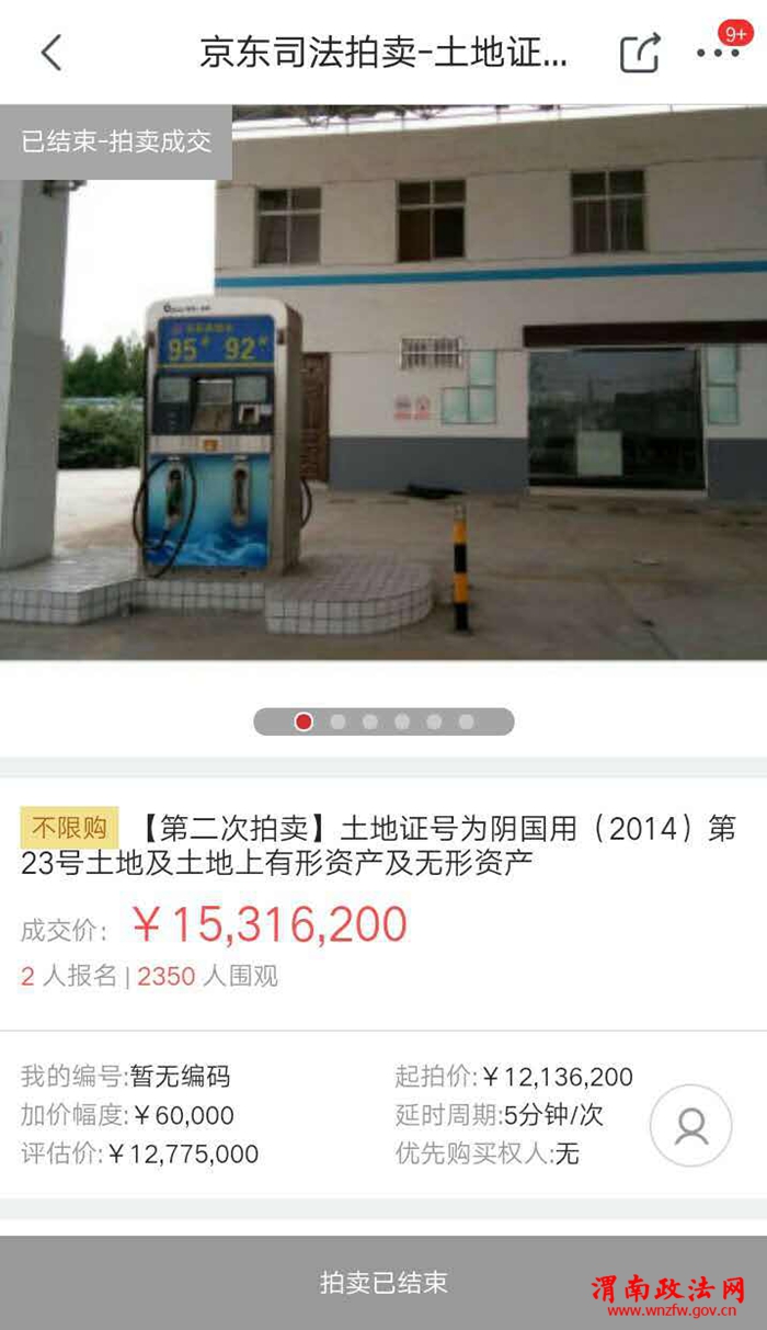 该院于8月25日在公拍网上发布拍卖公告,9月10日上午10点在网上正式开拍,整个竞拍过程十分激烈,历经24小时,50次的竞买,2000多人围观,最终被中国石油天然气股份有限公司陕西渭南分公司以高于起拍价318万元的价格竞买成功。相比较以前程序重复、时间跨度长的线下拍卖,此次拍卖借助互联网的方式从发布公告到拍卖成交,仅用了15天时间。